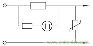 圖6中在特殊條件下使用的照明燈具, 要求極為嚴格, 采用了隔離變壓器, 這時壓敏電阻應在隔離變壓器的初級, 次級線圈繞組兩端同時使用壓敏電阻器, 它能吸收抑制來自輸入電壓的浪涌, 過壓雷擊或開關引起的電火花干擾等。