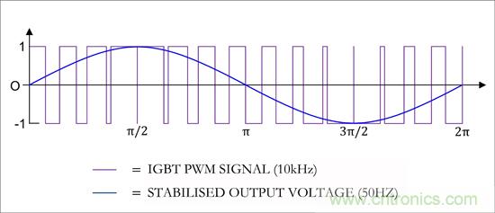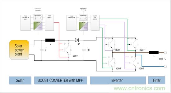 圖1:帶助推器和逆變器(頂部)的太陽能發電廠功能圖。每個IGBT驅動器都有一個良好的帶隔離的DC/DC轉換器供電。設備通過一個高頻PWM信號控制,這個信號輸出平滑的正弦波(左)。