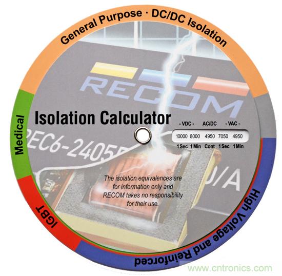 在某些規格書中,隔離電壓的測試時間有可能是1秒鐘或者1分鐘甚至是一個連續的長時間。測試加載時間越長,其測試電壓就會越低。為了使用戶能夠準確地確定這個關鍵值,RECOM提供一個CD光盤尺寸大少的免費ISO計算工具。一個隔離電壓時間規格的轉換器。只要發送郵件到info@recom-electronic.com 即可免費索取ISO計算器。另外,在網站www.recom-electronic.com上也可以找到這個在線工具。