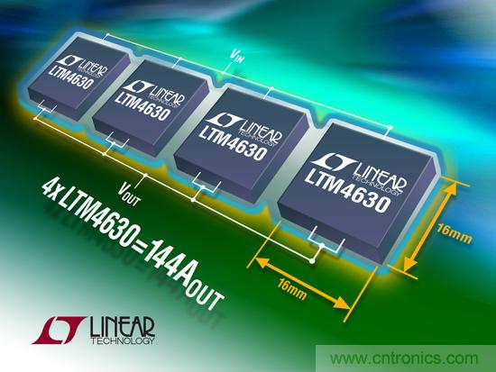 ●利用多個 LTM4630 實現(xiàn)多相并聯(lián)均流,電流可高達 144A