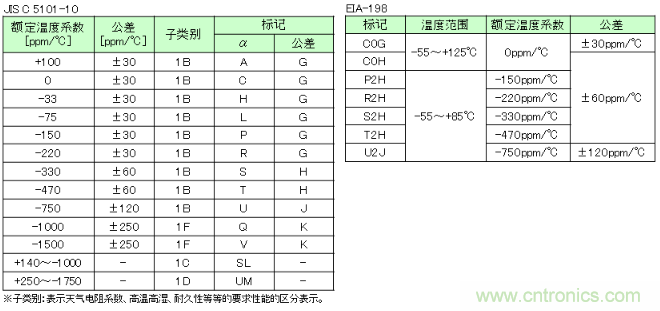 EIA標準中規定了0ppm/℃~-750ppm/℃范圍內的數種靜電容量溫度系數。關于代表性材料的溫度特性,如下所示(參考圖2)。適用的JIS及EIA標準的摘錄,如表1所示。