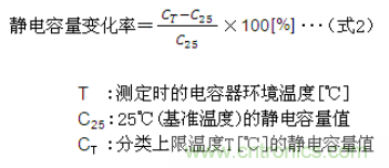 (2) 另一種是在公共標準中被歸類于Class2(種類2)的高介電常數獨石陶瓷電容器,使用了鈦酸鋇系的介電質材料,其靜電容量值對溫度呈現出不規則的變化。 因此,靜電容量-溫度特性的標準值是針對基準溫度(此處以25℃為基準)的靜電容量值C25,通過適用溫度范圍內的靜電容量變化率的最大值與最小值進行規 定。(參照式2)。
