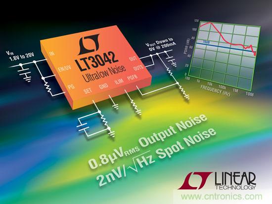 【導讀】近日,凌力爾特公司推出領先的具備超低噪聲、超高電源紋波抑制的低壓差電壓線性調節(jié)器 LT3042。該器件的優(yōu)勢在于具有僅為 2nV/√Hz (在 10kHz) 的超低點噪聲和 0.8µVRMS 的積分輸出噪聲 (在 10Hz 至 100kHz 的寬帶寬內)。該器件低頻和高頻 PSRR 性能使其占有巨大的優(yōu)勢。低頻 PSRR 超過 90dB (直到 10kHz),而高頻 PSRR 則超過 75dB (直到 3MHz),可使噪聲或高紋波輸入電源變得 “安靜”。