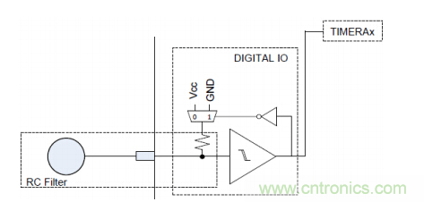 MSP430根據型號的不同支持多種電容觸摸檢測方式,有RC 震蕩、比較器、PIN RO,本設計使用的是PIN Relaxation Oscillator 方式,原理如圖,芯片管腳內部檢測電路由施密特觸發器、反向器,以及一個電阻組成,震蕩信號經過施密特觸發器變成脈沖信號,再通過反向器反饋回RC 電路,通過Timer_A對施密特觸發器的輸出進行記數,再通過設置測量窗口Gate 獲得記數的結果。當手指觸摸電極,電極上的C 產生變化,導致震蕩頻率改變,這樣在定長的測量窗口就能獲得不同的記數結果,一旦差值超過門限,結合一定的濾波算法判斷就可以觸發觸摸事件。