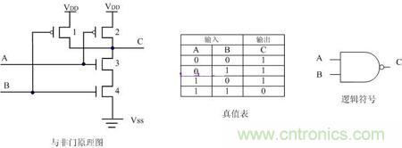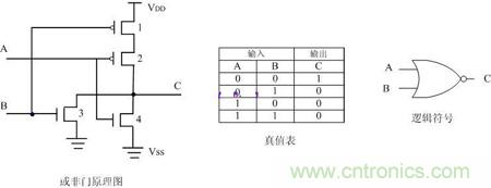 將上述“與非”門、“或非”門邏輯符號的輸出端的小圓圈去掉,就成了“與”門、“或”門的邏輯符號。而實現(xiàn)“與”、“或”功能的電路圖則必須在輸出端加上一個反向器,即加上一對CMOS管,因此,“與”門實際上比“與非”門復雜,延遲時間也長些,這一點在電路設計中要注意。