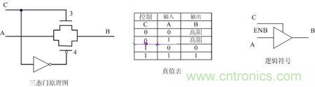 當控制端C為“0”時,3、4管都截止,輸入端A的電平狀況無法到達輸出端B,輸出端B呈現(xiàn)高電阻的狀態(tài),稱為“高阻態(tài)”。