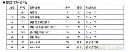 我們首先來看1602的引腳定義,1602的引腳是很整齊的SIP單列直插封裝,所以器件手冊只給出了引腳的功能數據表: