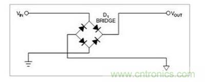 2,另外還可以用二極管橋對輸入做整流,這樣電路就永遠有正確的極性(圖2)。這些方案的缺點是,二極管上的壓降會消耗能量。輸入電流為2A時,圖1中的電路功耗為1.4W,圖2中電路的功耗為2.8W。