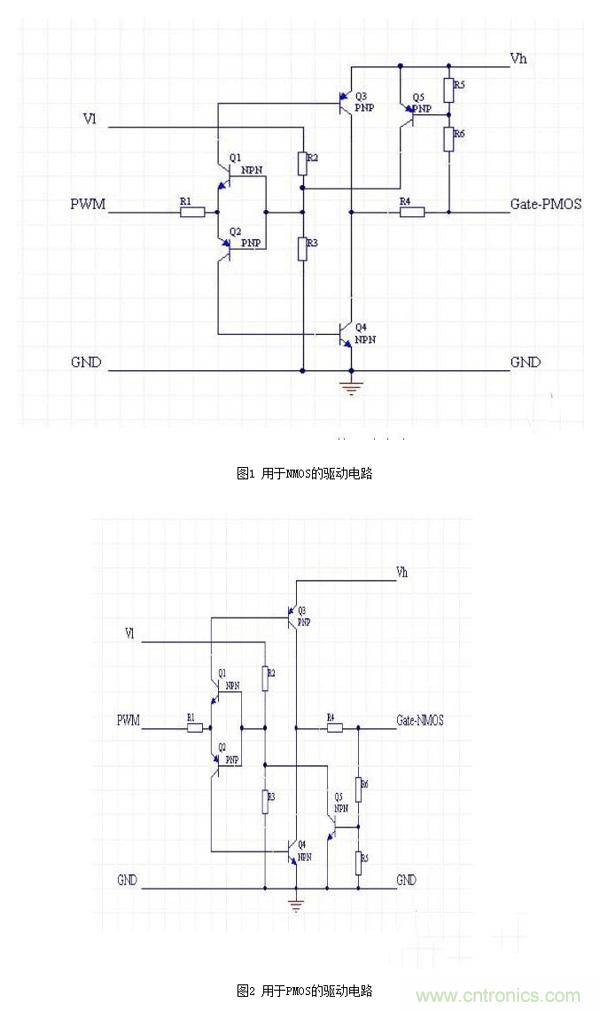 這里我只針對NMOS驅(qū)動電路做一個簡單分析:Vl和Vh分別是低端和高端的電源,兩個電壓可以是相同的,但是Vl不應(yīng)該超過Vh。Q1和Q2組成了一個反置的圖騰柱,用來實(shí)現(xiàn)隔離,同時確保兩只驅(qū)動管Q3和Q4不會同時導(dǎo)通。 R2和R3提供了PWM電壓基準(zhǔn),通過改變這個基準(zhǔn),可以讓電路工作在PWM信號波形比較陡直的位置。 Q3和Q4用來提供驅(qū)動電流,由于導(dǎo)通的時候,Q3和Q4相對Vh和GND最低都只有一個Vce的壓降,這個壓降通 常只有0.3V左右,大大低于0.7V的Vce。 R5和R6是反饋電阻,用于對gate電壓進(jìn)行采樣,采樣后的電壓通過Q5對Q1和Q2的基極產(chǎn)生一個強(qiáng)烈的負(fù)反饋, 從而把gate電壓限制在一個有限的數(shù)值。這個數(shù)值可以通過R5和R6來調(diào)節(jié)。
