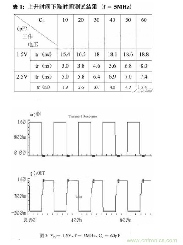 驅(qū)動電路基于Samsung AHP615 BiCMOS工藝設(shè)計并經(jīng)過Hspice仿真驗(yàn)證。在表1中給出了電路在不同工作電壓、不同負(fù)載條件下的上升時間tr和下降時間tf 的仿真結(jié)果。在圖5中給了電路工作在輸入電壓1.5V、工作頻率為5MHz、負(fù)載電容60pF條件下的輸出波形。