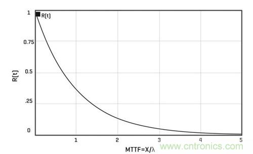 這是因為,具有恒定故障率的故障由一個指數因子表征,如以下等式所示,用于計算元器件在給定時間后沒有發生故障的可能性:R(t) = e-λt
