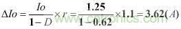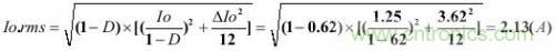 假設已知連續工作模式的反激變換器,其輸出電流Io為1.25A,紋波率r為1.1,占空比D為0.62,開關頻率為60kHz,由此可以計算次級紋波電流ΔIo和有效值電流Io.rms。