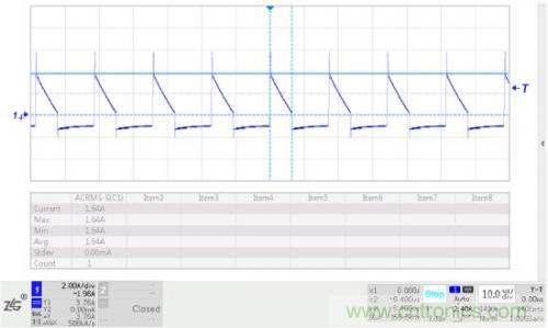 測試電解電容紋波電流時,需將電容引腳穿入電流探頭中,通過示波器可讀得交流有效值。本設計實例的紋波電流測試結果如圖3所示,示波器讀得有效紋波電流為1.64A,與理論設計接近。因此理論計算具有較大的工程指導意義。
