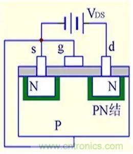 (1) VGS=0時,不管VDS極性如何,其中總有一個PN結(jié)反偏,所以不存在導(dǎo)電溝道。