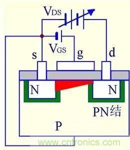 (4) VGS>0且VDS增大到一定值后,靠近漏極的溝道被夾斷,形成夾斷區(qū)。
