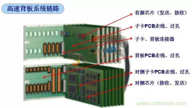 高速背板的設計除了關注背板PCBA設計要素以外,需要關注整個系統(tǒng)高速信號互連鏈路的設計,典型的高速信號鏈路參考下圖: