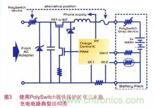 由于PolySwitch器件快速而有效地將過電流限制到安全水平,且體型小巧,可直接貼裝到電路板,因此,可使用該器件對PND內的每條電源電路進行一對一的保護。圖3為使用了PolySwitch電路保護器件的便攜式電子設備中的電池充電電路典型結構圖。PolySwitch和鉗位二極管共同保護設備不受過電壓、極性反轉等故障的損害,保護汽車電源及電路不因便攜式電子設備內部故障而損壞。