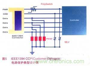 對USB/IEEE1394端口具有損害性的瞬態過電壓還包括來自于操作環境和外圍設備的ESD脈沖。瑞侃電路保護部開發的PESD器件電容極低,特別適用于數據傳輸速率很高的電路。PESD靜電保護器件具有低觸發電壓和低鉗位電壓,有助于保護敏感電子設備。圖4、圖5為瑞侃電路保護部推薦的電路保護典型設計圖。