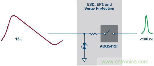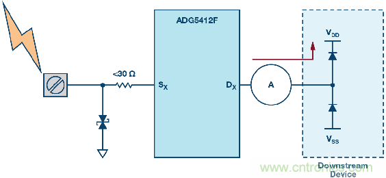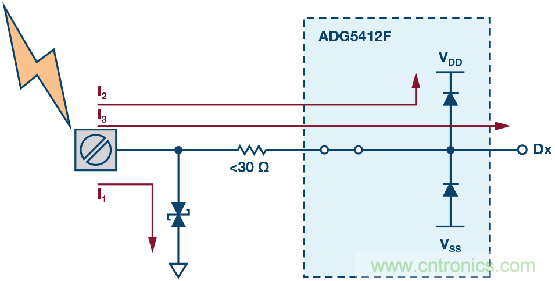 圖4也展示了高壓瞬變事件過程中的各種電流路徑。大部分電流通過TVS器件分流到地(路徑I1)。路徑I2展示的是通過ADG5412F輸出節點上的內部ESD消耗的電流,同時,輸出電壓被箝位于比電源電壓高0.7 V的水平。最后,路徑I3中的電流是下游器件必須承受的剩余電流水平。有關該保護電路的更多詳情,請參閱ADI公司應用筆記AN-1436。