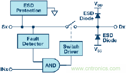 圖2顯示了一個典型過壓保護開關的功能框圖;注意,該開關的ESD保護二極管未以其輸入節點上的電源電壓為基準。相反,它有一個ESD保護單元,在超過器件最大承受電壓時激活,使器件能承受并阻斷超過其電源電壓的電壓。由于模擬系統通常只要求開關的外向引腳采用IEC保護,所以,ESD保護二極管依然保留在內向引腳上(標志為開關輸出端或漏極端)。這些二極管能帶來額外的好處,因為它們起到輔助保護器件的作用。在持續時間較短、上升時間快的高壓瞬變(如ESD或EFT)過程中,由于瞬變電壓會被箝位,所以電壓不會到達下游電路。在持續時間較長、上升時間慢的高壓瞬變(如浪涌)過程中,在開關過壓保護功能被激活、開關斷開、使故障完全與下游電路分離之前,內部保護二極管會箝位開關的輸出電壓。