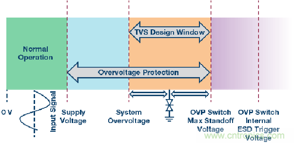 圖3顯示了一個與外部接口的系統輸入端的工作區域。最左邊的區域(綠色)表示正常工作區間,輸入電壓位于電源電壓范圍以內。左起第二個區域(藍色)表示輸入端可能存在持續直流或長時間交流過壓的范圍,原因是斷電、接線錯誤或短路。另外,圖中最右側(紫色)是過壓開關內部ESD保護二極管的觸發電壓。選擇的TVS擊穿電壓(橙色)必須小于過壓保護開關的最大承受電壓并且大于任何已知的可能持續直流或長時間交流過壓,以免無意中觸發TVS。