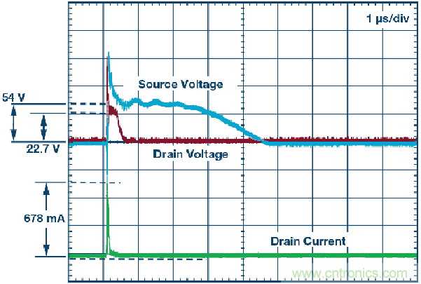圖6. 8 kV事件期間的漏極電壓和漏極輸出電流。