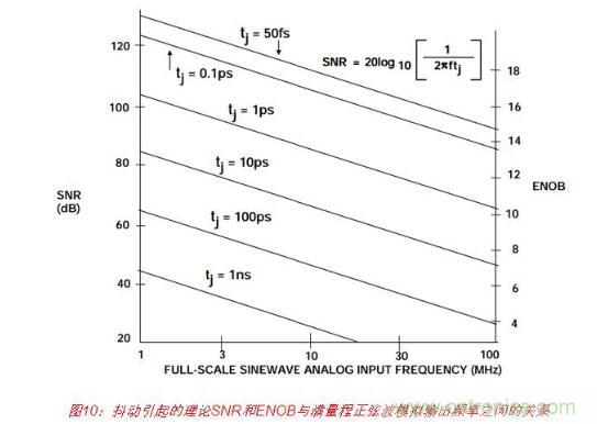 ADC寬帶孔徑抖動tj、轉換器SNR和滿量程正弦波模擬輸入頻率 f之間的關系如下: