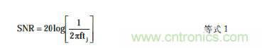 應注意,等式1中的t j 是采樣時鐘抖動t jc和ADC內部孔徑抖動t ja兩者相加;這兩個術語并不 相關,因此是在方和根(rss)基礎上相加的: