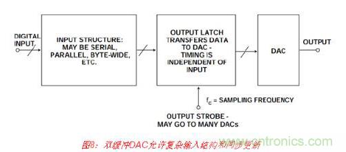 DAC輸入結構存在無數變化形式,本文將不一一介紹,但幾乎所有都稱為“雙緩沖”。栓 緩沖DAC具有兩組鎖存器。數據最初鎖存在第一級中,然后傳輸到第二級,如圖8所示。 這種配置非常有用,具體有以下幾種原因。