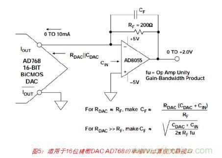 通過使用單個運算放大器作為I/V轉換器,便可輕松執行單端電流電壓轉換,如圖5所 示。AD768的10 mA滿量程DAC電流輸出可以在200 Ω RF電阻上產生0至+2 V的輸出電 壓。