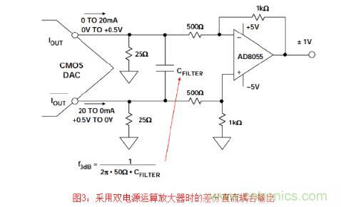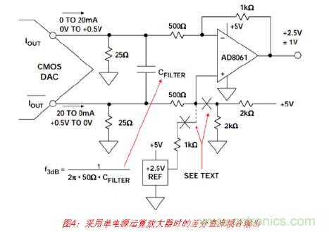 但是應注意,與差分工作模式相比,以這種方式使用DAC的單端輸出時,共模抑制性能將 下降,且2階失真產物將增加。