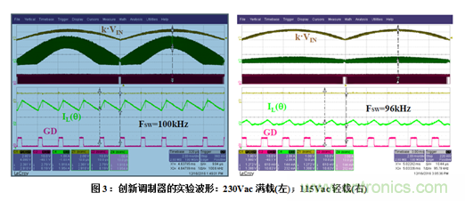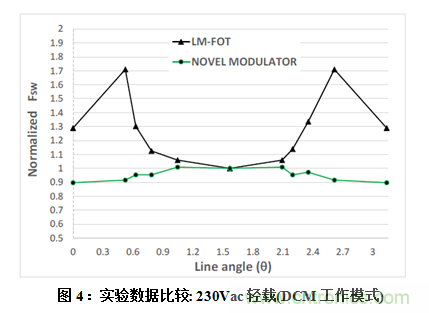 具體地講,圖3所示是開關頻率在寬輸入電壓(230Vac-左和115Vac-右)范圍和所有負載條件中(CCM-左, DCM - 右)保持恒定。與標準LM-FOT方法相比,本文提出的創新調制器的性能大幅改進,特別是在高壓線DCM運行模式更為明顯,如圖4所示。