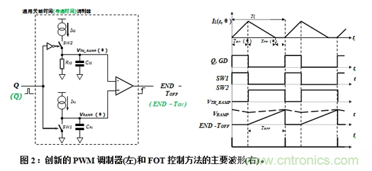 本文介紹一種創新的自適應穩壓器(AC/DC或DC/DC)脈寬調制器(PWM),基于“固定關斷時間(FOT)”或“恒定導通時間(COT)”控制方法,可以在全工況下(例如,滿負載CCM或中低負載DCM模式,寬輸入輸出電壓)以恒定開關頻率工作,無轉換器的寄生參數(例如,功率開關和濾波電感器的電阻)的負面影響。此外,本文提出的調制器電路與轉換器拓撲無關(升壓、降壓、反激式等),只與功率開關管柵極驅動邏輯信號(GD)有關,節省芯片引腳數量,且/或降低設計復雜程度。