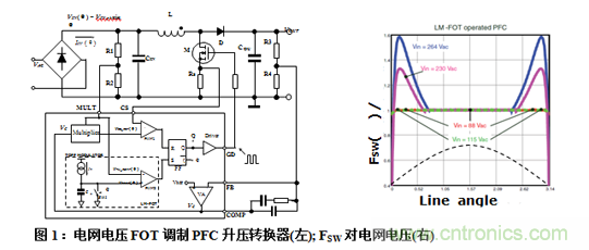 例如,用FOT方法控制CCM PFC前級升壓穩壓器,導致開關頻率隨電網電壓和負載條件而發生明顯變化[1]。按照實時電網電壓調制關斷時間,可以降低開關頻率(TOFFKt Vin, pksinθ), 如圖1所示,只要升壓級是CCM模式,最終開關頻率是恒定的[2],如圖1右圖所示。