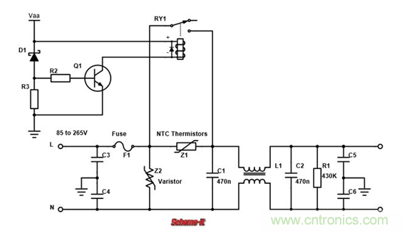 繼電器初始是斷開的。當(dāng)Vaa逐漸達到自身電壓的時候,齊納二極管D1導(dǎo)通,三極管Q1打開,繼電器RY1閉合,相當(dāng)于把限流NTC熱敏電阻Z1短路。