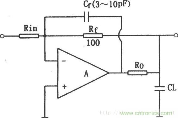 對于許多集成運算放大電路,若輸出負載電容CL的值比100pF大很多,由于輸出電容(包括寄生電容)與輸出電阻將造成附加相移,這個附加相移的累加就可能產(chǎn)生寄生振蕩,使放大器工作嚴重不穩(wěn)定。解決這一問題的方法是在運放的輸出端串聯(lián)一個電阻Ro,使負載電容CL與放大電路相隔離,如圖所示,在Ro的后面接反饋電阻Rf,這樣可以補償直流衰減,加反饋電容Cf會降低高頻閉環(huán)電壓放大倍數(shù),Cf的選取方法是:使放大電路在單位增益頻率fT時的容抗Xcf≤Rf/10,又Xf=l/(2πfTCf),一般情況下,Ro=50~200Ω,Cf約為3~10pF。