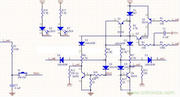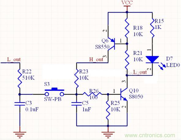 利用Q10的輸出與輸入狀態(tài)相反(非門)特性和電容的電流積累特性。剛上電時Q6和Q10的發(fā)射結(jié)均被10K電阻短路所以Q6和Q10均截止,此時實測電路耗電流僅為0.1uA,L_out輸出高,H_out輸出低。此時C3通過R22緩慢充電最終等于VCC電壓,當按下S3后C3通過R26給Q10基極放電,Q10迅速飽和,Q6也因此飽和,H_out變?yōu)楦唠娖剑擟3放電到Q10be結(jié)壓降0.7V左右時C3不再放電,此時若按鍵彈開C3將進一步放電到Q10的飽和壓降0.3V左右,當再次按下S3,Q10即截止。