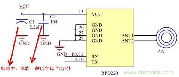 電容在電路中的標識一般以字母“C”開頭,在“C”的后面敷以數字,以表示電容在電路中的序號,例如圖中的C103,C104.就是指這個電路中的第103個,104個電容。