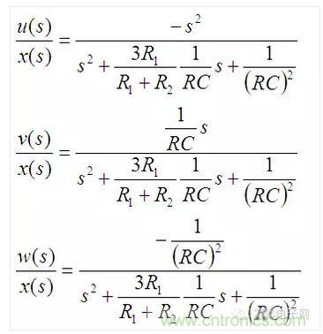 上面三個(gè)式子分別對(duì)應(yīng)高通、帶通和低通濾波器,如果將u、v、w三路信號(hào)加權(quán)疊加則可以組成任意的二階系統(tǒng)。