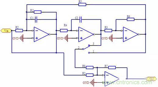 帶阻信號(hào)如果再與低通信號(hào)相加,就能夠組成低通帶阻型或高通帶阻型。下面是電路原理圖。