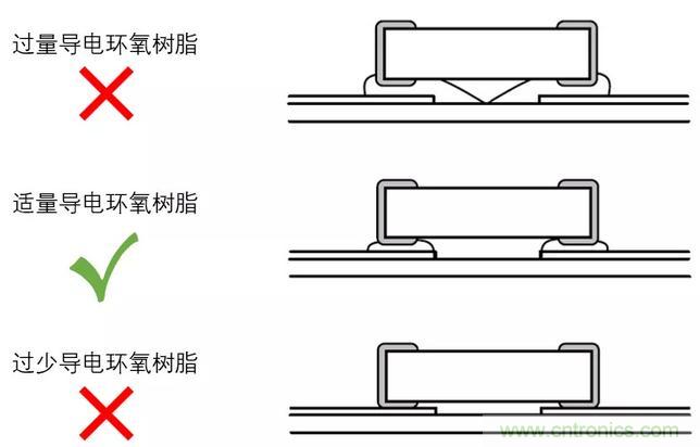 涂導電環氧樹脂時需要注意使用的量,過量的導電環氧樹脂可能會增加短路的風險,過少的導電環氧樹脂可能會造成物理連接不牢固。