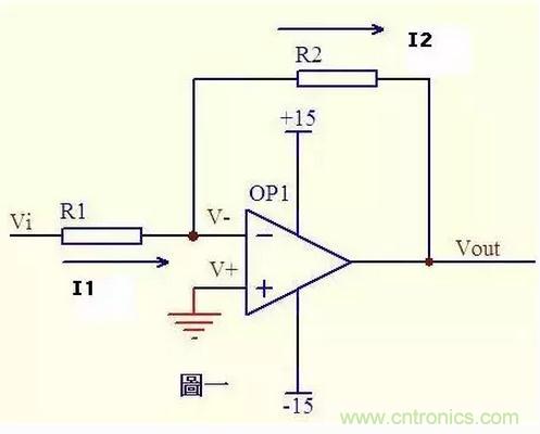 圖一運放的同向端接地=0V,反向端和同向端虛短,所以也是0V,反向輸入端輸入電阻很高,虛斷,幾乎沒有電流注入和流出,那么R1和R2相當于是串聯的,流過一個串聯電路中的每一只組件的電流是相同的,即流過R1的電流和流過R2的電流是相同的。 流過R1的電流I1 = (Vi - V-)/R1 ……a 流過R2的電流I2 = (V- - Vout)/R2 ……b V- = V+ = 0 ……c I1 = I2 ……d 求解上面的初中代數方程得Vout = (-R2/R1)*Vi 這就是傳說中的反向放大器的輸入輸出關系式了。