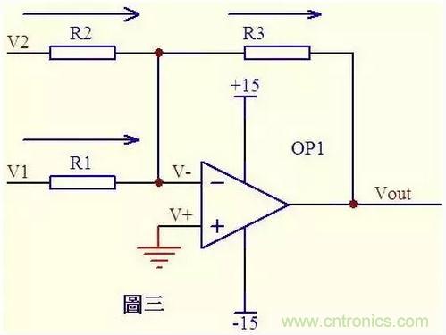 圖三中,由虛短知: V- = V+ = 0 ……a 由虛斷及基爾霍夫定律知,通過R2與R1的電流之和等于通過R3的電流, 故 (V1 – V-)/R1 + (V2 – V-)/R2 = (Vout – V-)/R3 ……b 代入a式,b式變為V1/R1 + V2/R2 = Vout/R3 如果取R1=R2=R3,則上式變為Vout=V1+V2,這就是傳說中的加法器了。