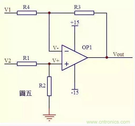 圖五由虛斷知,通過R1的電流等于通過R2的電流,同理通過R4的電流等于R3的電流,故有 (V2 – V+)/R1 = V+/R2 ……a (V1 – V-)/R4 = (V- - Vout)/R3 ……b 如果R1=R2, 則V+ = V2/2 ……c 如果R3=R4, 則V- = (Vout + V1)/2 ……d 由虛短知 V+ = V- ……e 所以 Vout=V2-V1 這就是傳說中的減法器了。
