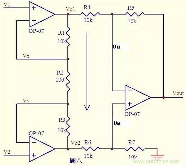 圖八.由虛短知 Vx = V1 ……a Vy = V2 ……b 由虛斷知,運放輸入端沒有電流流過,則R1、R2、R3可視為串聯,通過每一個電阻的電流是相同的, 電流I=(Vx-Vy)/R2 ……c 則: Vo1-Vo2=I*(R1+R2+R3) = (Vx-Vy)(R1+R2+R3)/R2 ……d 由虛斷知,流過R6與流過R7的電流相等,若R6=R7, 則Vw = Vo2/2 ……e 同理若R4=R5,則Vout – Vu = Vu – Vo1,故Vu = (Vout+Vo1)/2 ……f 由虛短知,Vu = Vw ……g 由efg得 Vout = Vo2 – Vo1 ……h 由dh得 Vout = (Vy –Vx)(R1+R2+R3)/R2 上式中(R1+R2+R3)/R2是定值,此值確定了差值(Vy –Vx)的放大倍數。 這個電路就是傳說中的差分放大電路了。