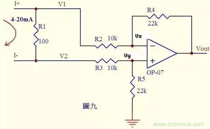 分析一個大家接觸得較多的電路。很多控制器接受來自各種檢測儀表的0~20mA或4~20mA電流,電路將此電流轉換成電壓后再送ADC轉換成數字信號,圖九就是這樣一個典型電路。如圖4~20mA電流流過采樣100Ω電阻R1,在R1上會產生0.4~2V的電壓差。由虛斷知,運放輸入端沒有電流流過,則流過R3和R5的電流相等,流過R2和R4的電流相等。 故: (V2-Vy)/R3 = Vy/R5 ……a (V1-Vx)/R2 = (Vx-Vout)/R4 ……b 由虛短知: Vx = Vy ……c 電流從0~20mA變化,則V1 = V2 + (0.4~2) ……d 由cd式代入b式得(V2 + (0.4~2)-Vy)/R2 = (Vy-Vout)/R4 ……e 如果R3=R2,R4=R5,則由e-a得Vout = -(0.4~2)R4/R2 ……f 圖九中R4/R2=22k/10k=2.2,則f式Vout = -(0.88~4.4)V,即是說,將4~20mA電流轉換成了-0.88 ~ -4.4V電壓,此電壓可以送ADC去處理。