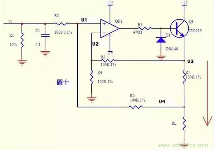 電流可以轉換成電壓,電壓也可以轉換成電流。圖十就是這樣一個電路。上圖的負反饋沒有通過電阻直接反饋,而是串聯了三極管Q1的發射結,大家可不要以為是一個比較器就是了。只要是放大電路,虛短虛斷的規律仍然是符合的!