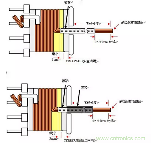 ④變壓器中有加鐵氟龍套且有折回線時,其出入線所加之鐵氟龍套管須與 骨架的凹槽口齊平(或至少達2/3高),并自骨架的凹槽出線以防止因套管過長造成拉力將線扯斷。但若為L形引腳水平方向纏線,則套管應與 骨架邊齊平(或至少2/3長),如圖7所示。