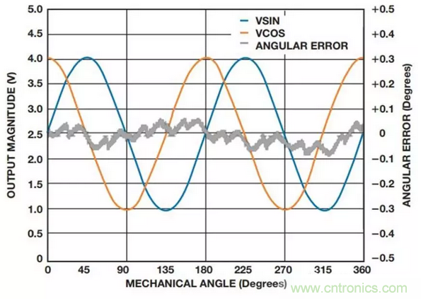 以Analog Devices公司的ADA4571 系列為例,圖2顯示了旋轉(zhuǎn)磁場施加在360° 機械旋轉(zhuǎn)情形時ADA4571的典型高輸出電平和角度誤差。經(jīng)微控制器進行偏移校正后,典型誤差小于0.1°。