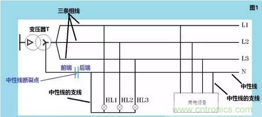 我們?cè)賮砜磮D1。圖1中的中性線發(fā)生了斷裂,于是在斷裂點(diǎn)的前方,中性線的電壓依舊為零,但斷裂點(diǎn)的后方若三相平衡時(shí),它的電壓為零;但若三相不平衡,則斷裂點(diǎn)后方的中性線電壓會(huì)上升,最高會(huì)升到相電壓。